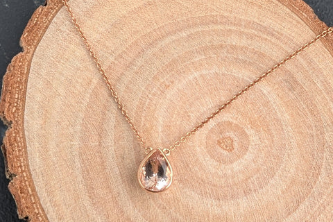 A solitaire pear shape pink morganite set in 14k rose gold.