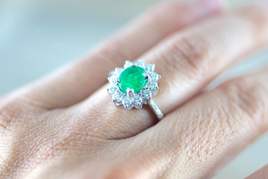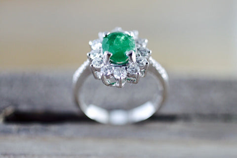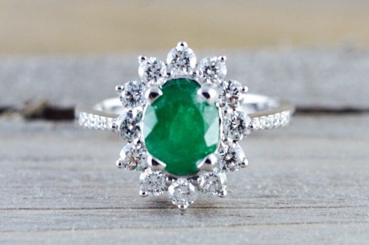 A beautiful oval green genuine earth mined emerald gemstone. The ring is surrounded by natural diamonds.