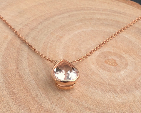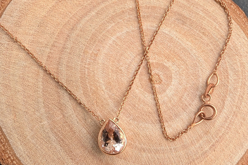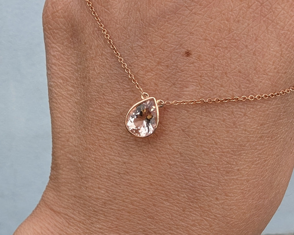 A solitaire pear shape pink morganite set in 14k rose gold.