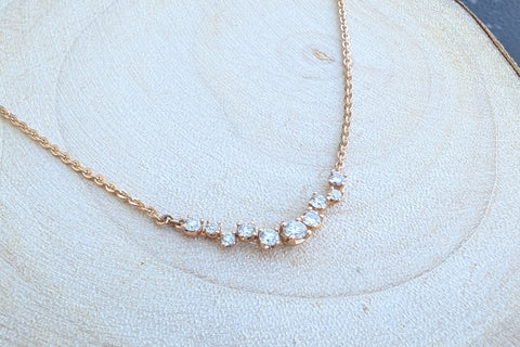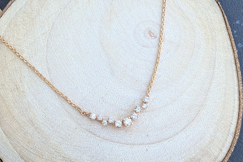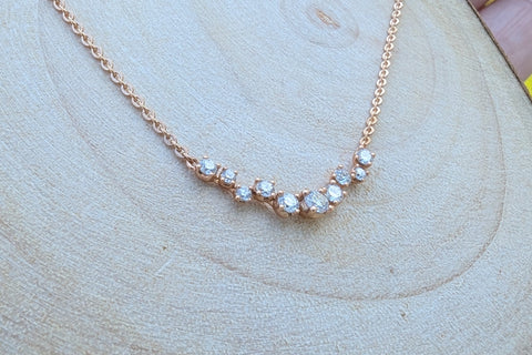Curve shaped staggered diamond pendant is attached to a rose gold chain is 18" long and has jumper at 16" and 17" length for adjust ability in length.