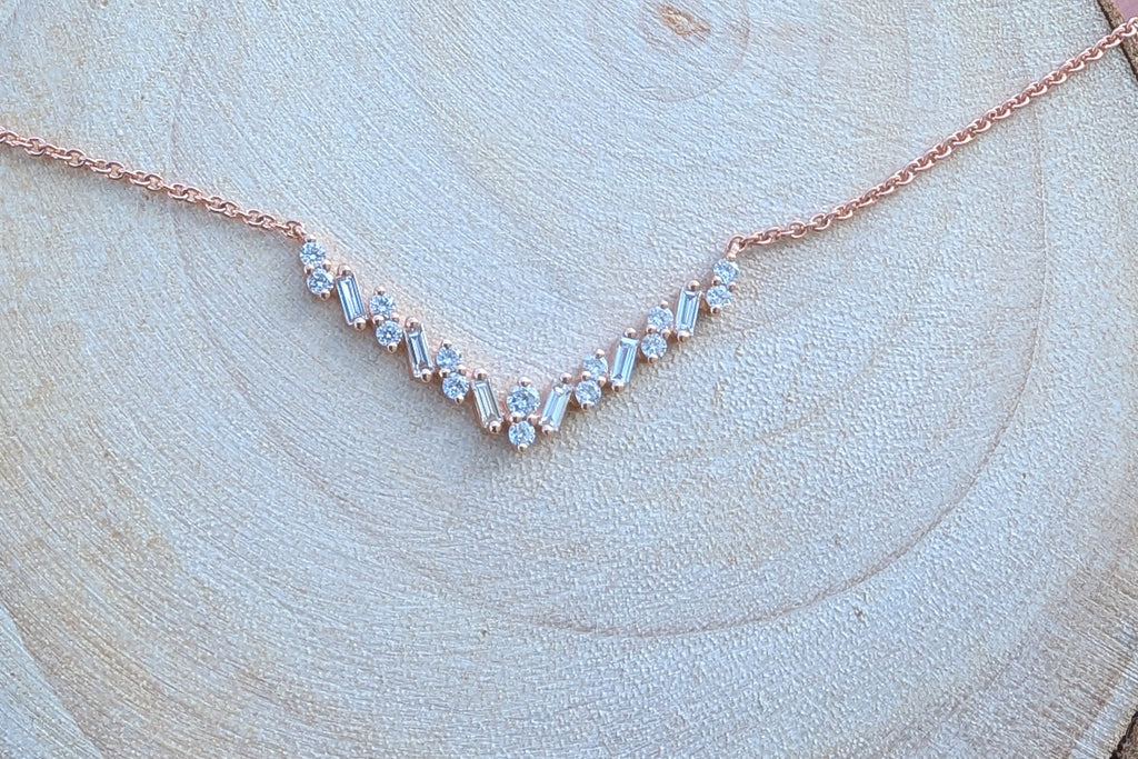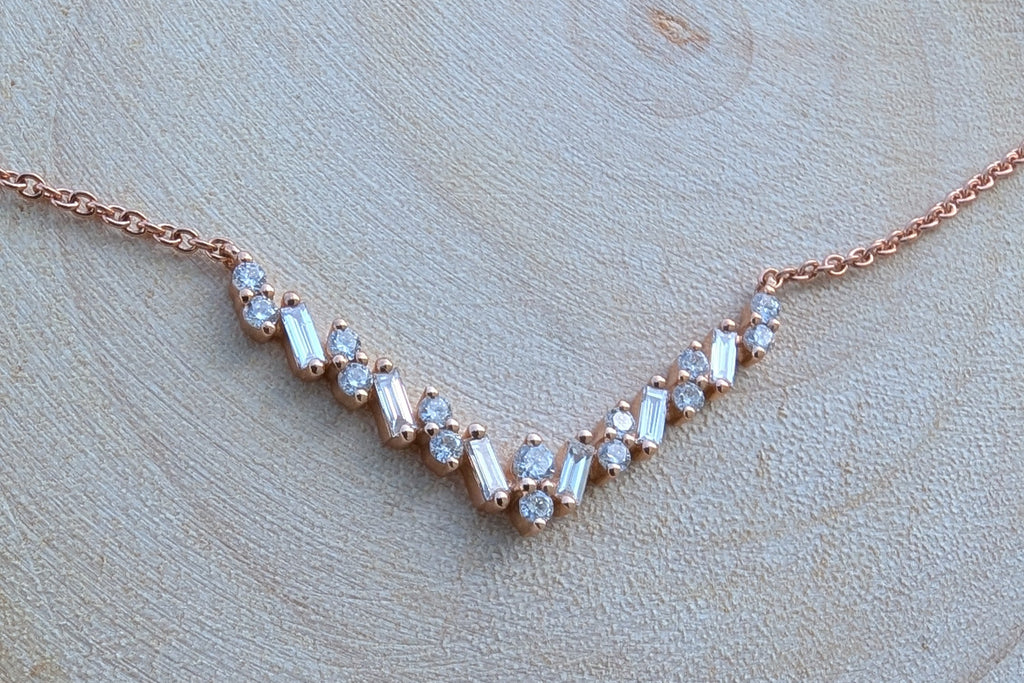 V shaped baguette diamond pendant is attached to a rose gold chain that is 18" long and has jumper at 16" and 17" length for adjust ability in length.